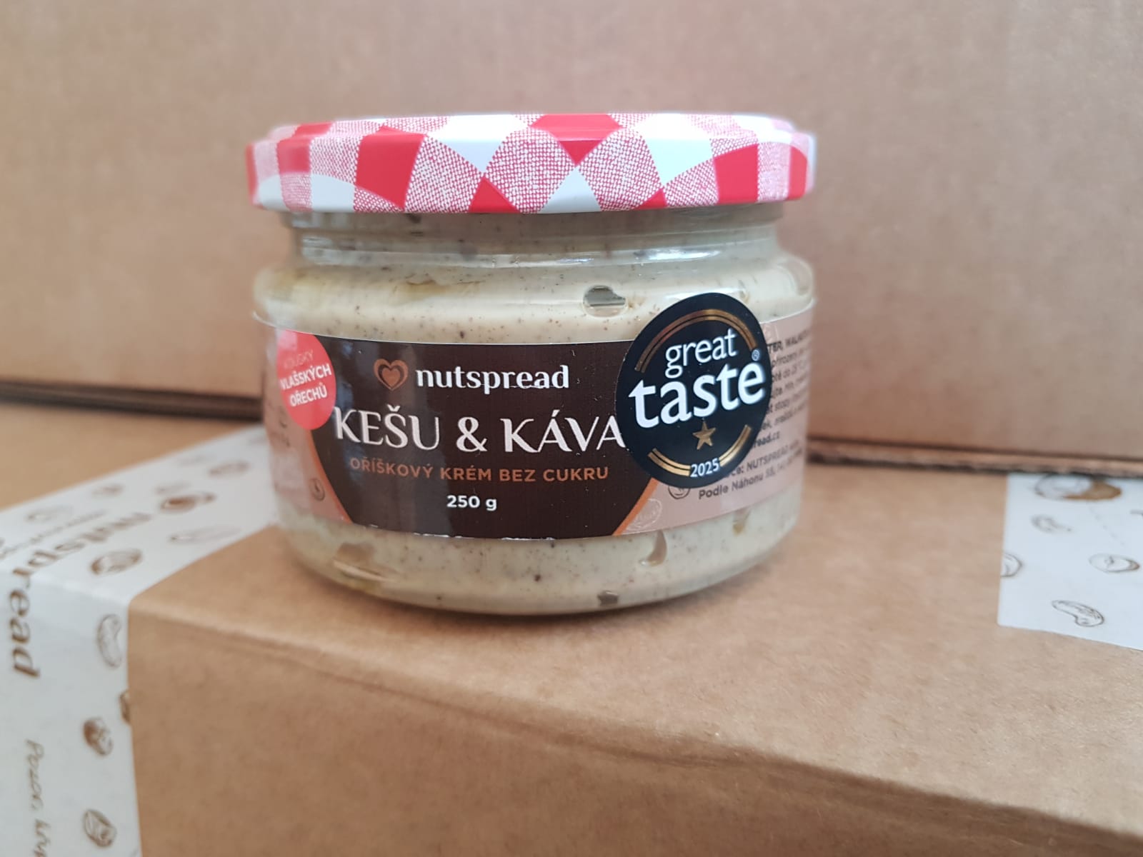 Kešu máslo s kávou a vlašskými ořechy?! Pro mnoho z Vás je to vůbec to nejlepší ořechové máslo, které kdy ochutnali. Tento luxusní oříškový krém vznikl jako dárek Nutspread ke Dni Dětí 2015 a podle všeho se opravdu vydařil - ojedinělá a nápaditá chuťová kombinace vytváří oříškovou pomazánku tak dobrou, že je škoda ji vůbec na něco namazat :-) Po neskutečných deseti letech v našem sortimentu se tomuhle máslu dostalo ocenění nejvyššího - získalo na prestižní gastronomické soutěži v Londýně cenu Great Taste Awards! Gratulujeme :)