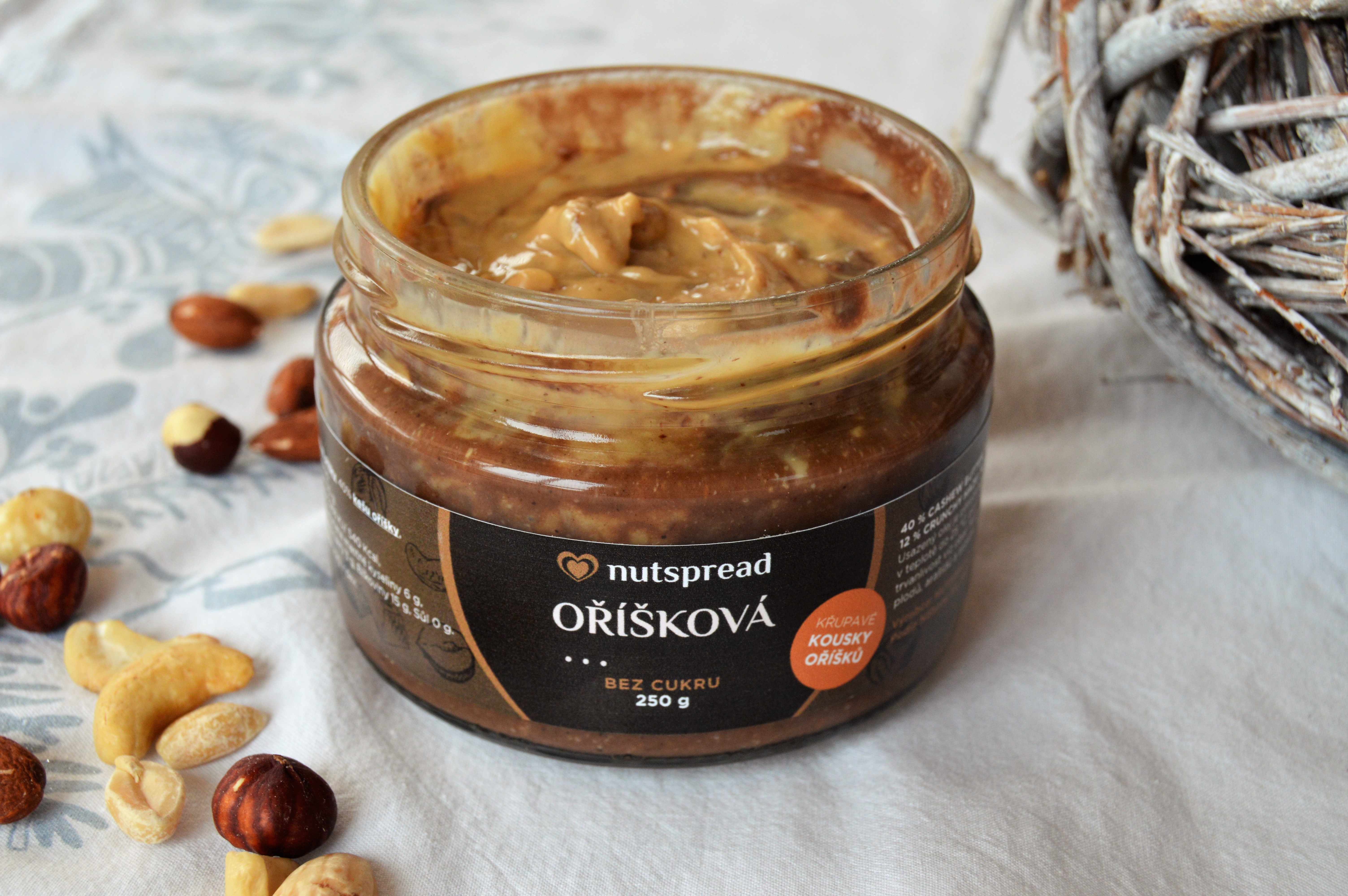 Křupavý ořechový krém z lískových ořechů, kešu ořechů a kakaa a křupavý krém z arašídů, kešu ořechů a mandlí se špetkou soli. Bez cukru, lepku a přídatných látek. Vysoký obsah proteinů, vhodné pro sportovce a vegany.